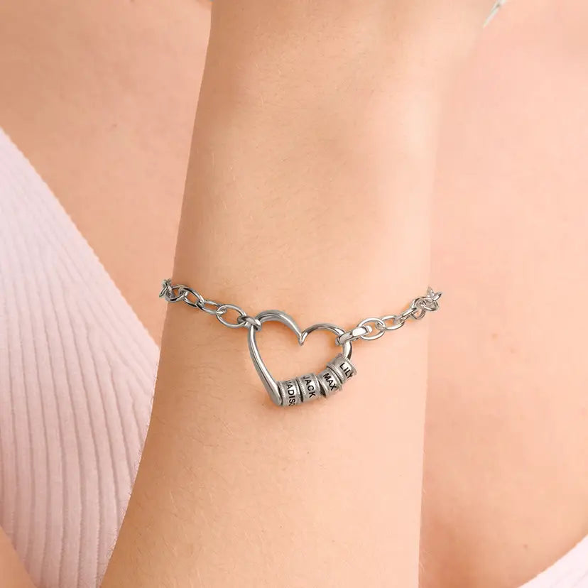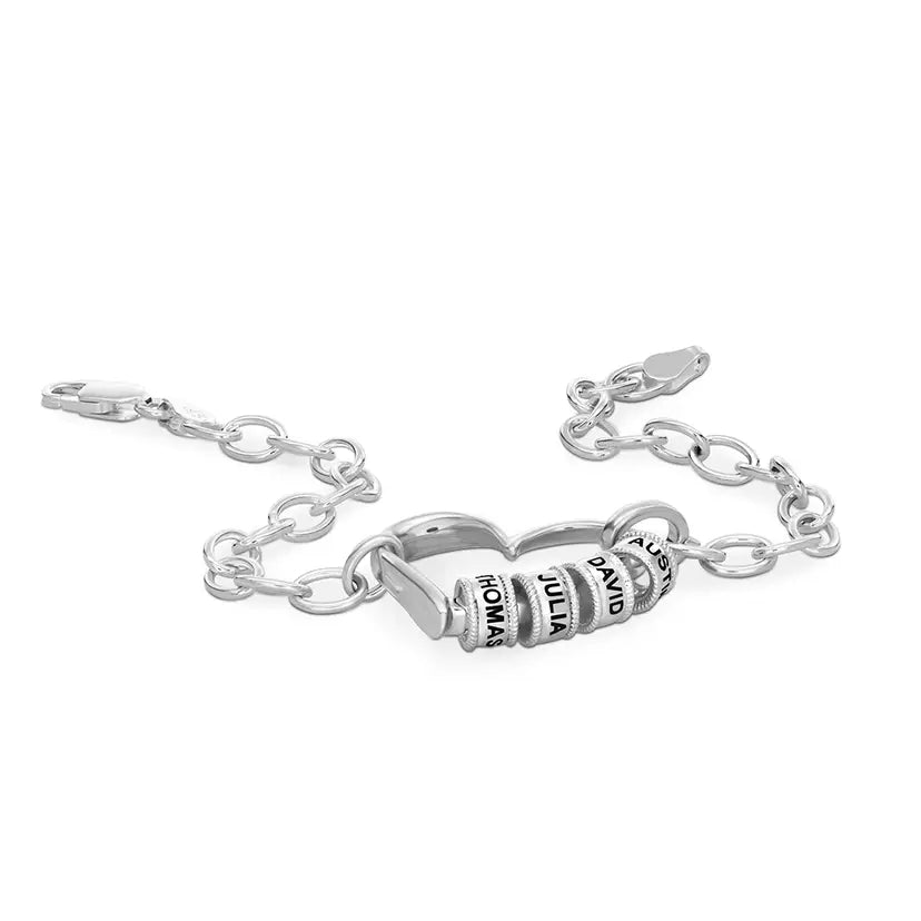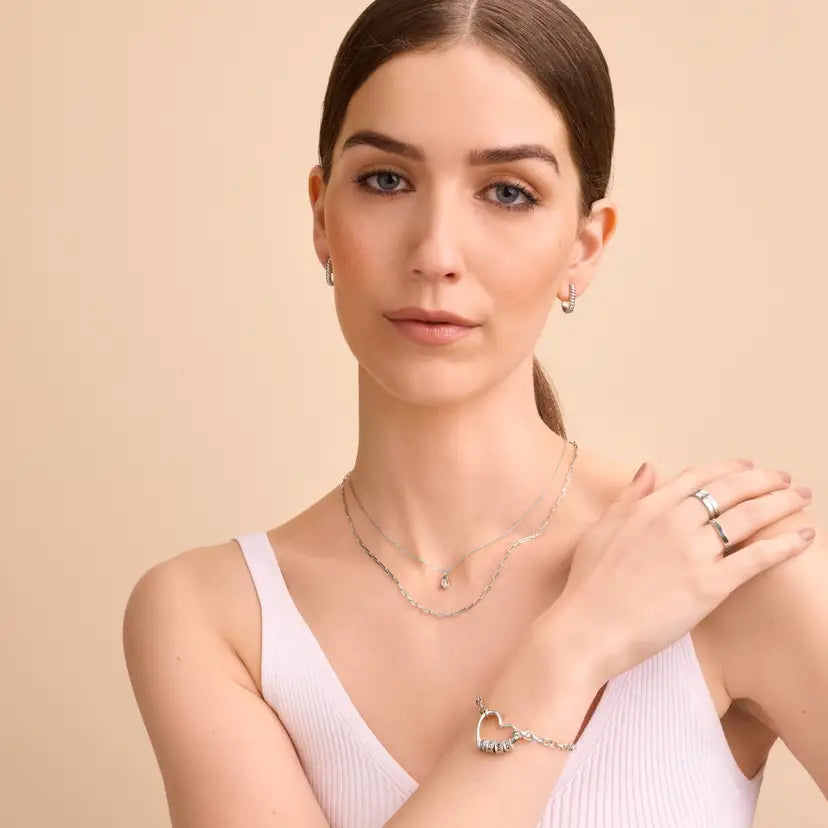 Le bracelet Delina se caractérise par une chaîne à maillons ouverts élégante et subtilement brillante, qui lui confère un charme à la fois moderne et intemporel. La pièce centrale en forme de cœur peut accueillir jusqu'à quatre perles gravées, ajoutant une touche personnelle à son design épuré et structuré. Une pièce polyvalente qui s'accorde facilement avec tous les styles.